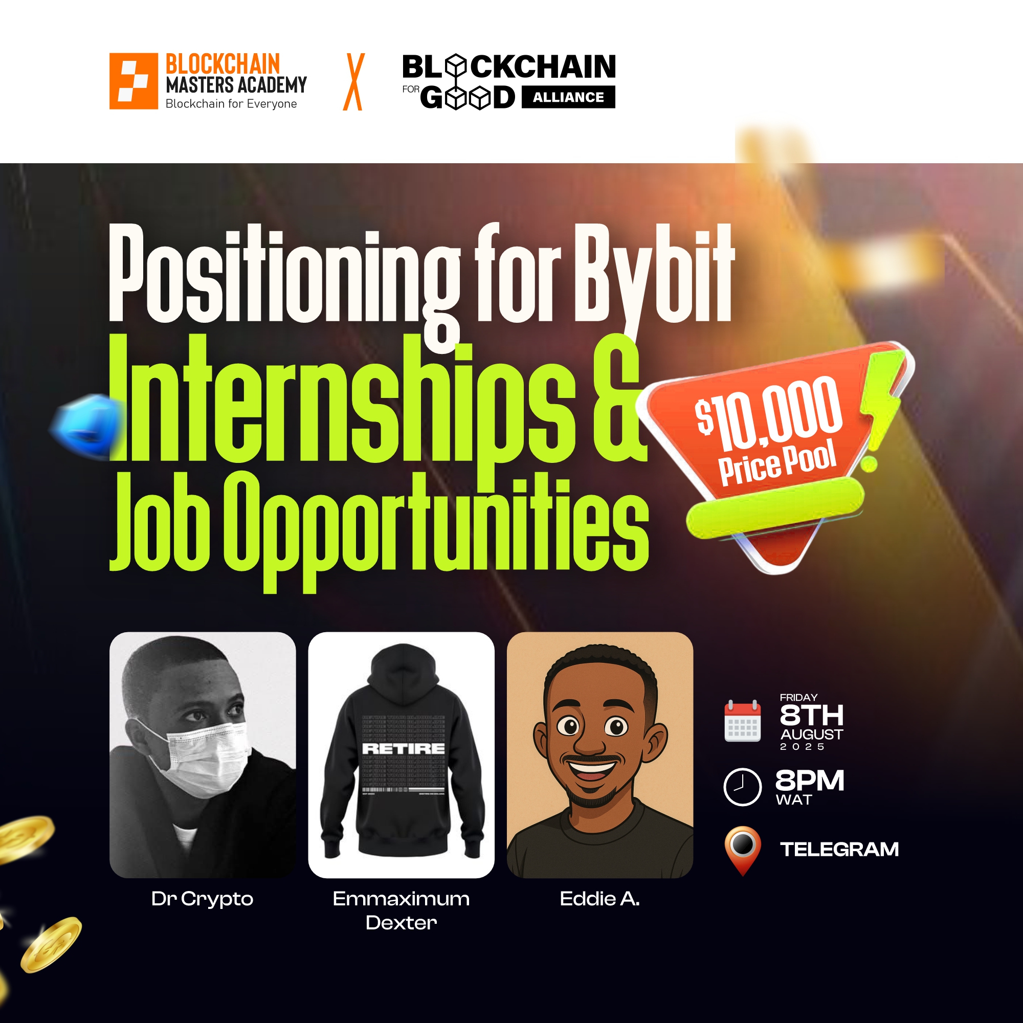 On Saturday being the 9th of August 2025, we “BGA Team" joined us for an AMA session 🔥 After dissecting "Positioning for Bybit's Internship and Job Opportunities" and having our speakers shared alphas around Web 3 jobs, we dived straight to receiving a representative from BGA who shared more about the opportunities presented by Bybit and BGA 🔥 You shouldn't miss any of these for any reason. The goal is simple - Blockchain for Everyone 🔥